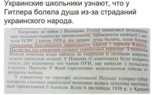 Юрий Вряшник из Днепра опубликовал отрывок из учебника истории, где сказано, что «готовясь к войне с Польшей Гитлер пытался разжечь украино-польское противостояние, привлечь на свою сторону симпатии жителей УССР. 1 апреля 1939 года он заявлял: душа болит, когда видим страдания благородного украинского народа… пришло время для создания общей украинской державы. А после падения Польши немецкая власть заняла по отношению к украинцам (в частности, к оуновцам) позицию поддержки и союзничества…».